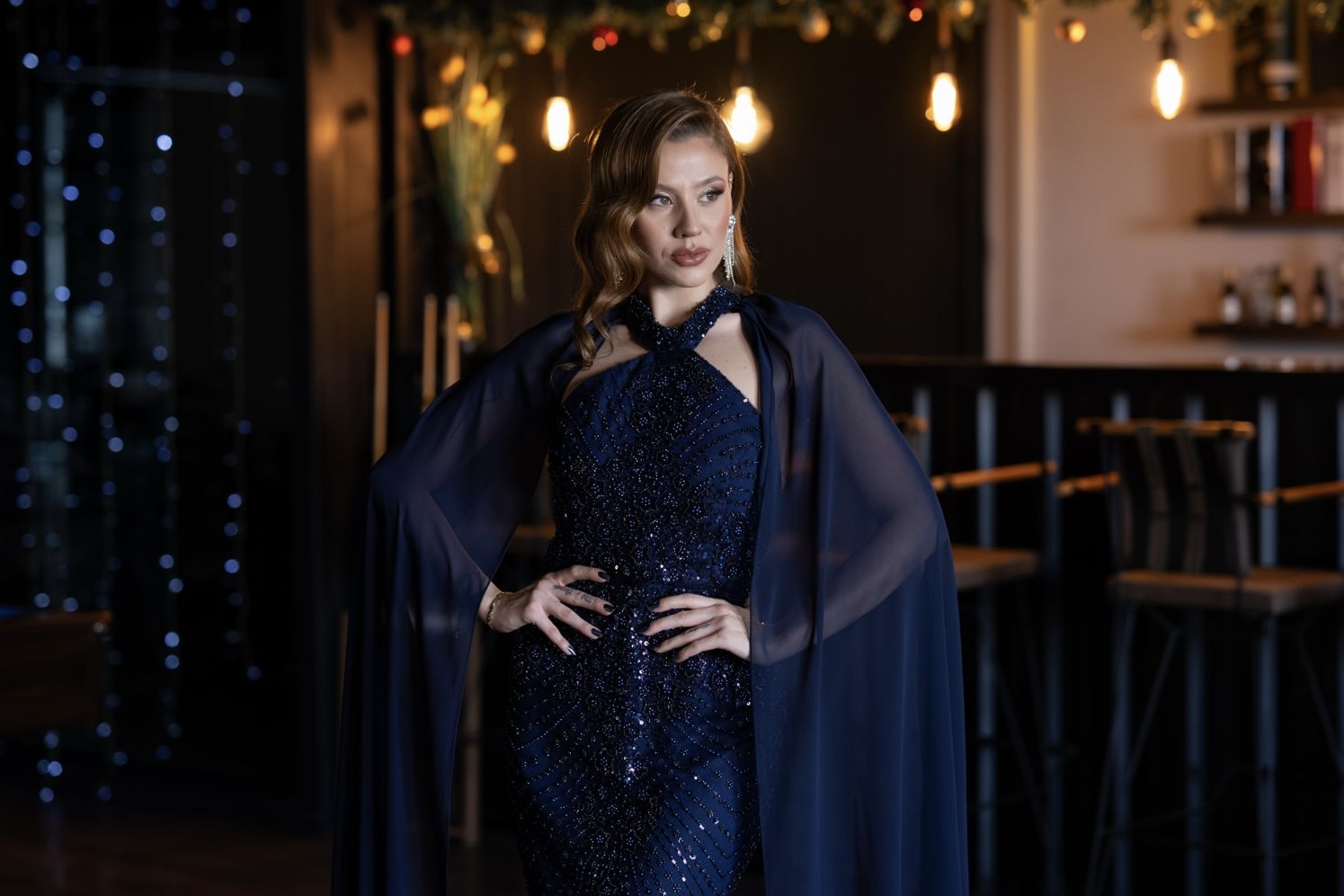 Derin lacivert tonu, tüm yüzeye yayılan pul ve boncuk işlemelerle birleşerek sofistike bir ışıltı sunar. Işıkla birlikte hareket kazanan yüzey, tasarımı klasik abiye anlayışının ötesine taşır. İnce işçilikle yerleştirilen detaylar, zengin ama ölçülü bir görünüm oluşturur.
