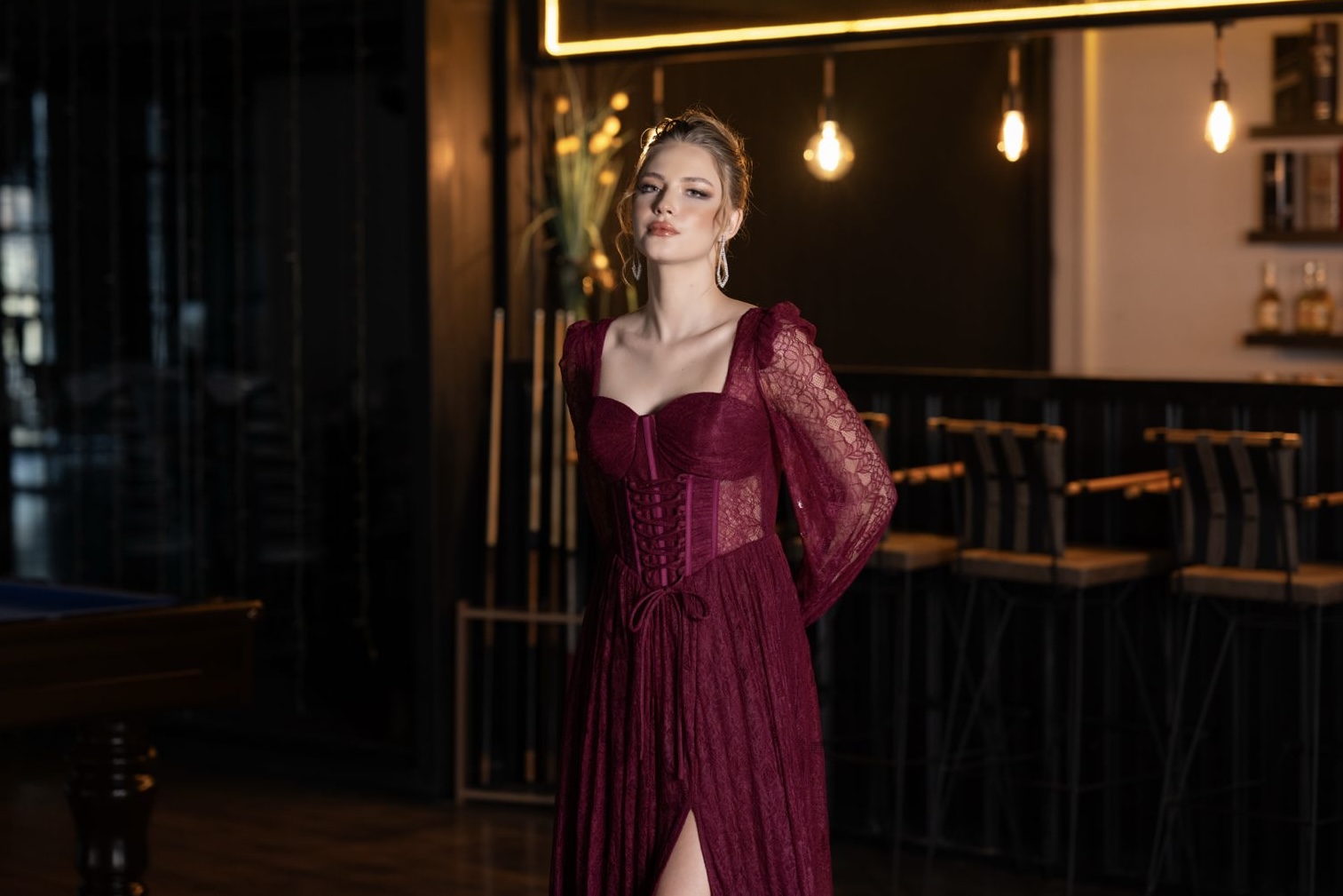 Vişne çürüğü (mürdüm) tonu, 2026 renk paletinde asaletin ve derinliğin temsilcisi olarak zirvede. Bu renk, dantel kumaşın her bir ilmeğindeki zarafeti ortaya çıkarırken, ışığı yansıtma biçimiyle de geceye gizemli bir hava katıyor. Özellikle hareket halindeyken derin yırtmacın yarattığı o akışkan form, statik bir şıklıktan ziyade dinamik ve etkileyici bir görünüm vadediyor.