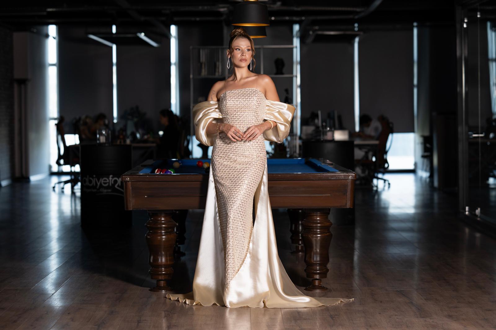 Saten dokunun zarif dokunuşları, ışığı yakalayarak her açıdan kusursuz bir parlaklık yansıtır. İşçiliğiyle öne çıkan abiye, ince dikiş detayları ve kusursuz kalıbıyla vücudu sararak feminen bir görünüm sunar. Modern dokunuşlarla harmanlanmış bu klasik ihtişam, lüks giyim anlayışının en seçkin örneklerinden biri.