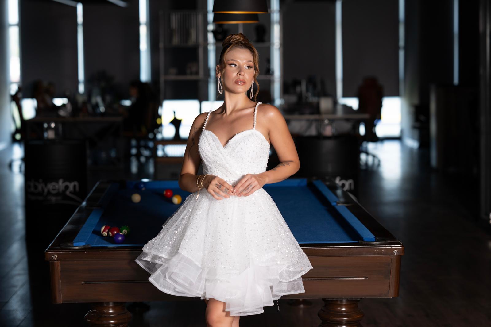 Taş detaylı kısa elbise, bu tür davetler için ideal bir tercih. Abartıya kaçmadan zarafeti yakalamanı sağlıyor. Katmanlı tül dokusu ve beyazın saflığı, sana hem şıklık hem de sofistike bir duruş katıyor.