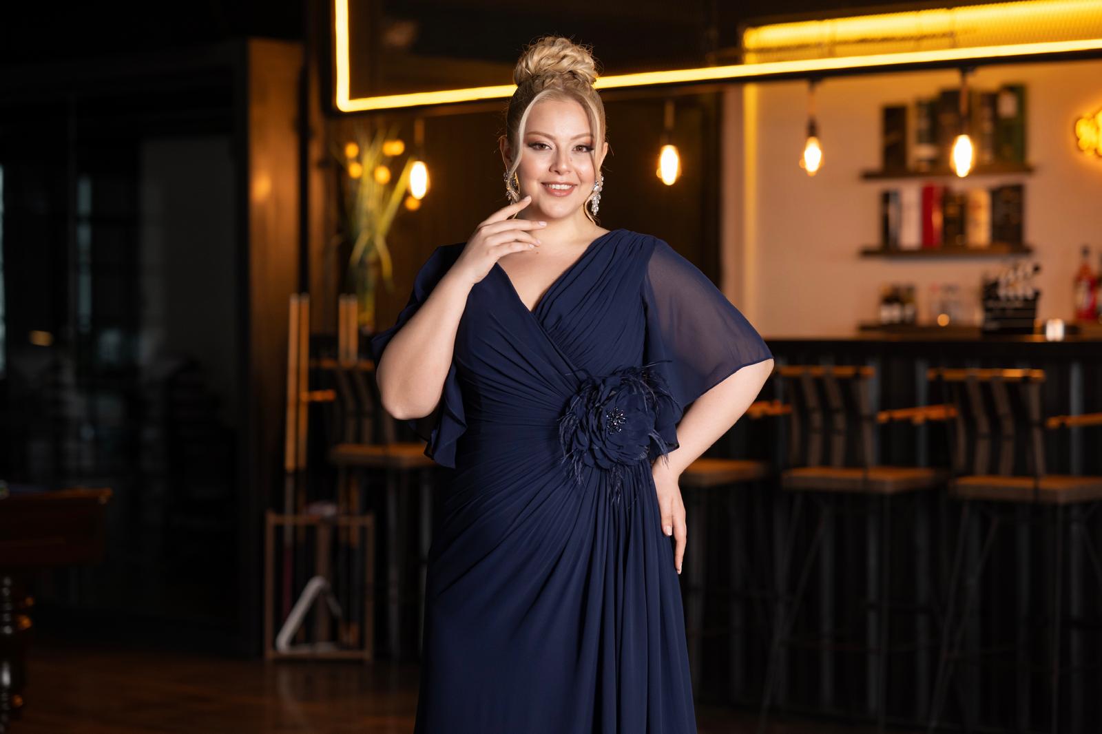 Bu değişimin en güzel örneklerinden biri, görselde yer alan lacivert büyük beden abiye elbise. Sade ama etkileyici tasarımıyla hem klasik bir duruş sergiliyor hem de modern detaylarla göz alıcı bir görünüm kazandırıyor. Elbisenin V yaka kesimi, boyun hattını zarif bir şekilde vurgularken; şifon formundaki kollar, kol bölgesinde rahat bir görünüm ve konfor sağlıyor. İnce drapelerle şekillenen gövde kısmı, vücut hatlarını yumuşak bir biçimde sarıyor ve bel bölgesindeki büyük çiçek detayıyla romantik bir vurgu yapıyor.