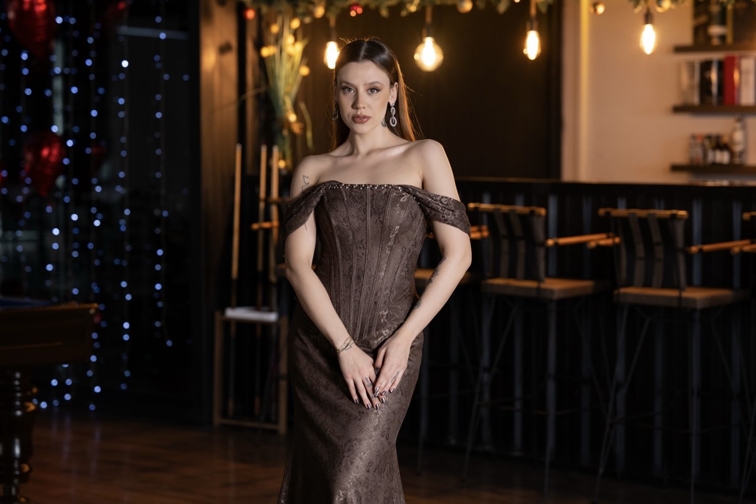 Kahve tonu, gece elbiselerinde kullanılan kesim ve kumaşı doğrudan ön plana çıkaran bir etkiye sahiptir. Siyahın zaman zaman gizlediği dikişler, drapeler ve form detayları, bu renkte çok daha net ve sofistike görünür. Drapeler daha belirgin durur, kumaş kalitesi daha kolay ayırt edilir ve siluet daha yumuşak bir denge kazanır. Bu nedenle kahve tonlarında tasarlanan modeller, özellikle zarif kesimlerde güçlü ve rafine bir etki yaratır.