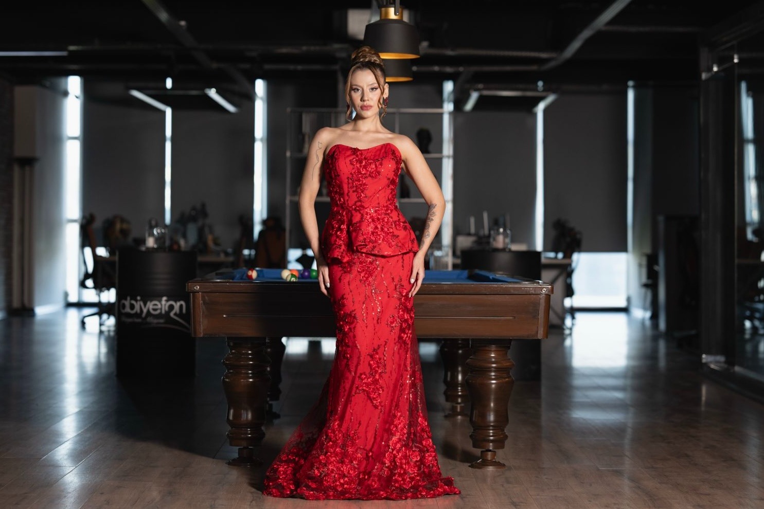Kırmızının büyüsünü, zarif bir siluetle birleştiren bu özel tasarım, gecenin en unutulmaz görünümlerinden birini yaratıyor. Straplez yaka formu, omuzları zarifçe vurgularken; üç boyutlu çiçek işlemeleri elbiseye sanat eseri niteliğinde bir dokunuş kazandırıyor. Her bir çiçek motifi, dikkatle yerleştirilmiş parlak taşlarla birleşerek ışıltılı bir görünüme dönüşüyor.