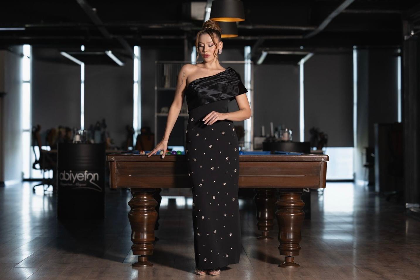 Görseldeki gibi tek omuzlu ve saten dokulu üst bölümle birleşen taş detayları ise modern zarafetin sessiz ama etkili bir ifadesidir.
