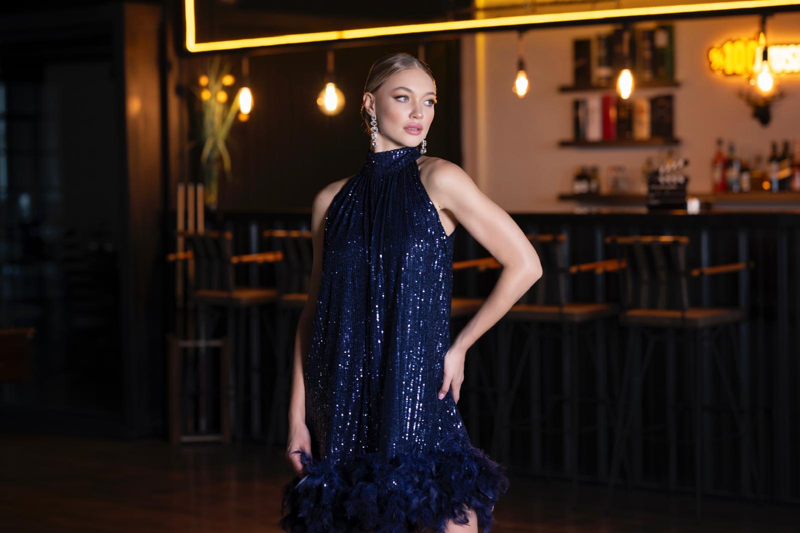 Sezonun en dikkat çeken modellerinden biri olan bu kısa abiye, klasik zarafeti modern dokunuşlarla birleştiriyor. Halter yaka kesimi, parıltılı kumaşı ve etek ucundaki tüy detayıyla hem sade hem de özgün bir görünüm sunuyor. Gösterişli olmaya çalışmadan farkını ortaya koymak isteyenler için birebir. Zarif ama sıkıcı değil, enerjik ama abartısız. Bu elbise, tarzını net bir şekilde ortaya koymak isteyenler için akıllı bir tercih.