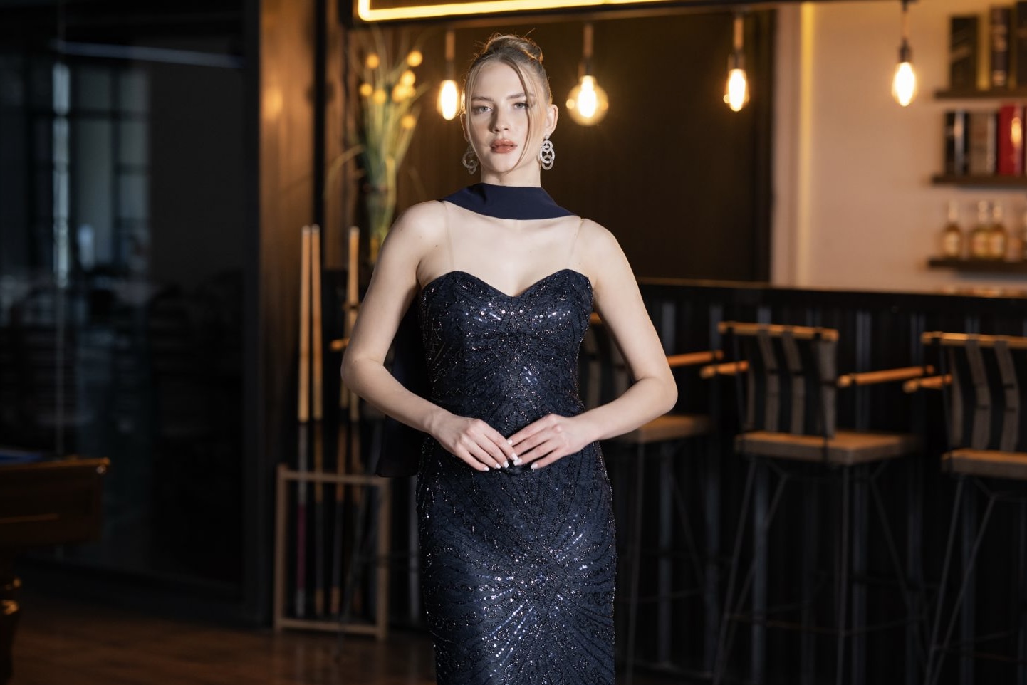 Saç ve Makyaj Uyumu: Boyun detayını kapatmamak için saçları sıkı bir topuz veya şık bir at kuyruğuyla geriye toplamak en doğru tercihtir. Makyajda ise elbisenin lacivert tonlarına eşlik eden buğulu gözler ve doğal dudak tonları, modern bir görünüm sağlar.