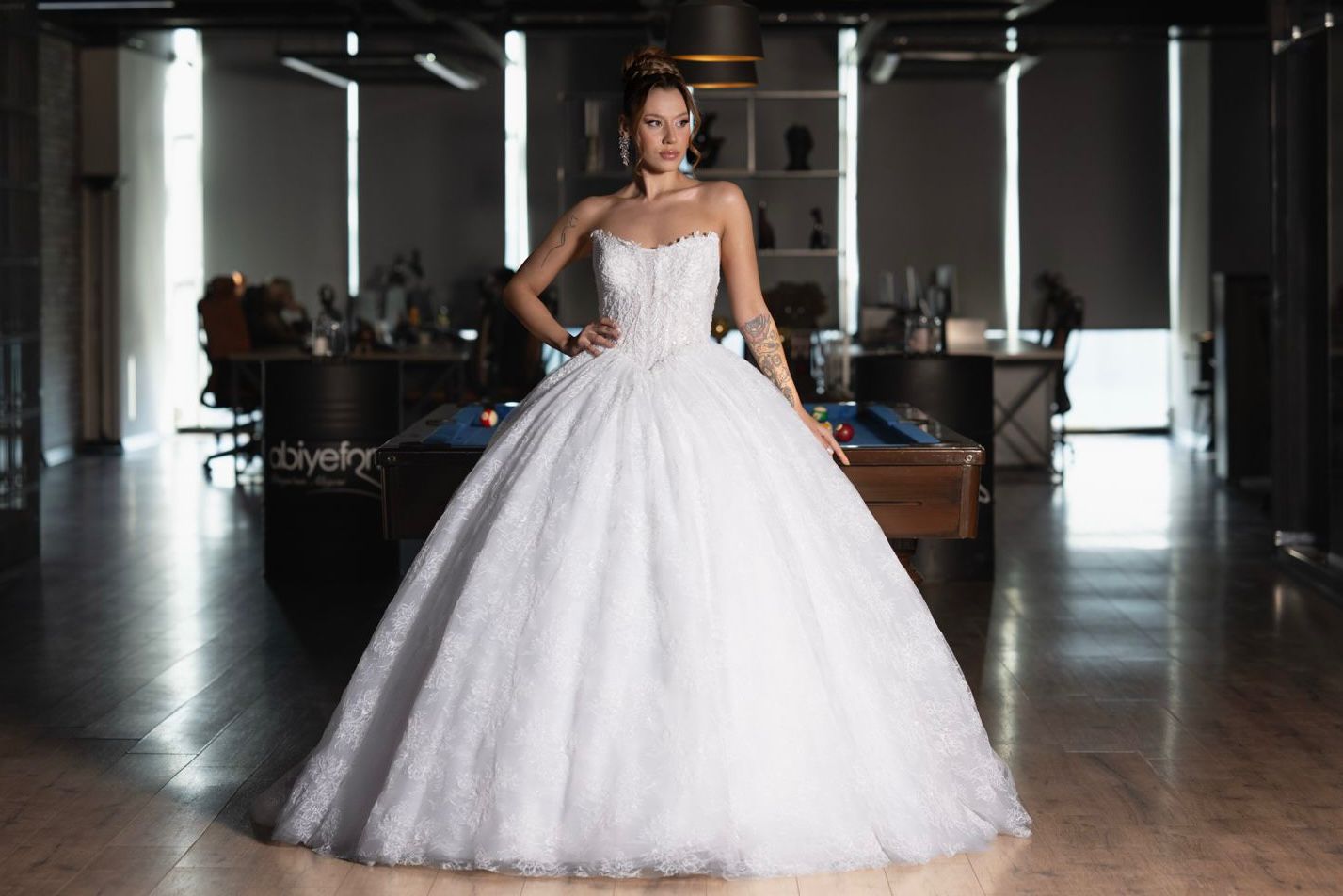 Tüm bu gösterişli silueti tamamlayan en büyüleyici unsurlardan biri de dantel detayları ve ince işlemeler. Üst beden kısmından eteğe doğru uzanan el işçiliği danteller hem dokunsal bir zenginlik hem de görsel derinlik katıyor. Çiçek motifli işlemeler, sanki tülün üzerinde dans ediyor; her bir dikiş gelinliğe kendine özgü bir ruh veriyor. Bu detaylar, gelinliğin karakterini belirleyen adeta küçük birer sanat eseri gibi.